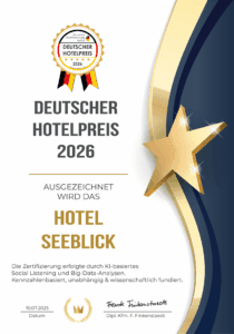 Der „Deutsche Hotelpreis“ ist ein hochwertiges Qualitätssiegel, das ausschließlich an Hotels verliehen wird, die in allen Bereichen herausragende Leistungen erbringen. Es steht für höchste Standards in Service, Komfort, Sauberkeit und Gastfreundschaft. Dieses Siegel symbolisiert nicht nur eine Auszeichnung, sondern auch das Vertrauen der Gäste in ein außergewöhnliches Hotelerlebnis.